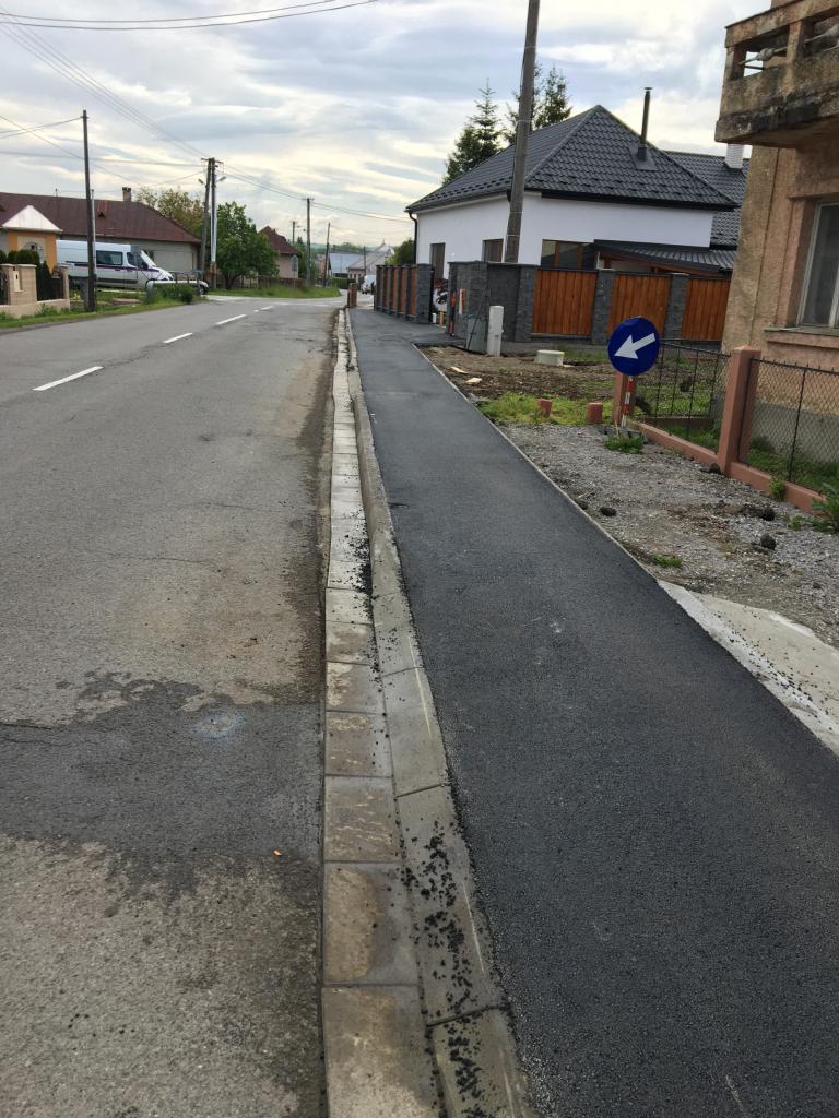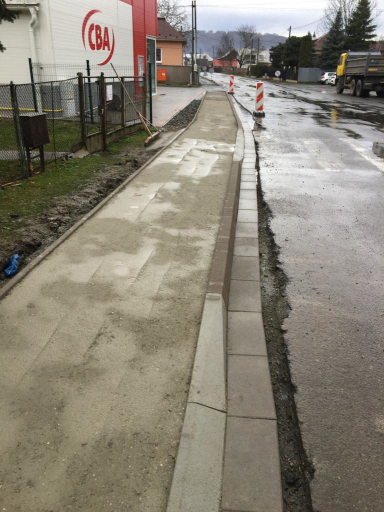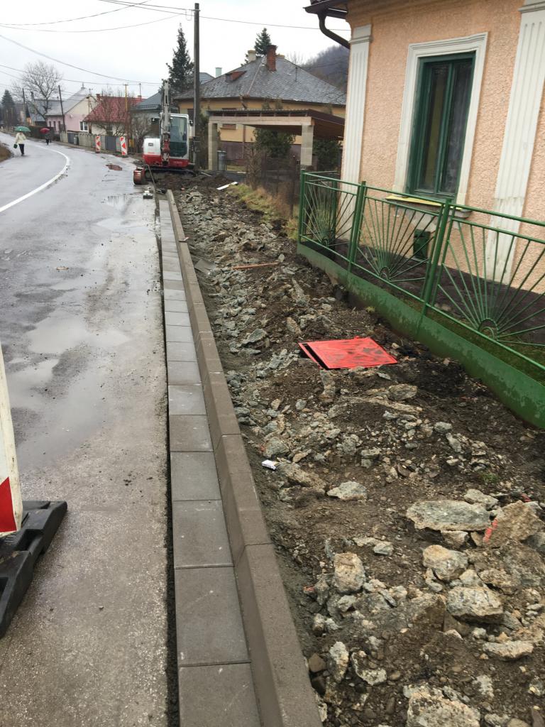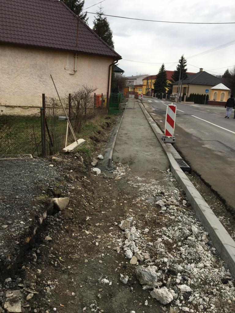 Pôvodný chodník sa vybúra v plnom rozsahu vrátane podkladového betónu, obrubníkov a vjazdov k rodinným domom. Šírka nového chodníka bude 1,5m všade tam, kde to umožňuje priestor.