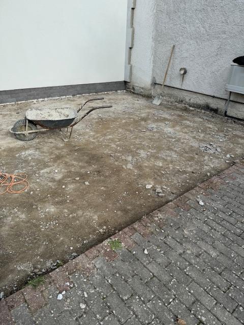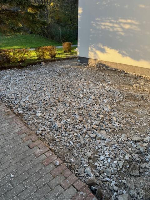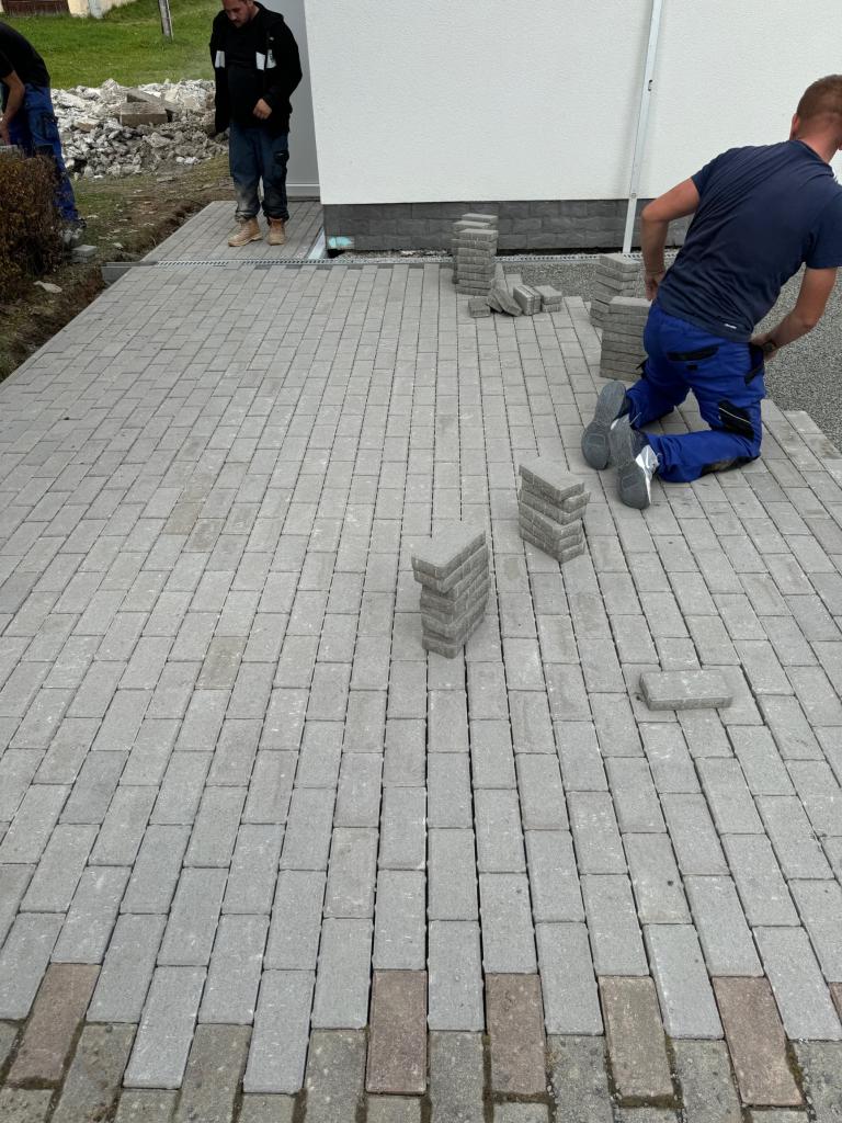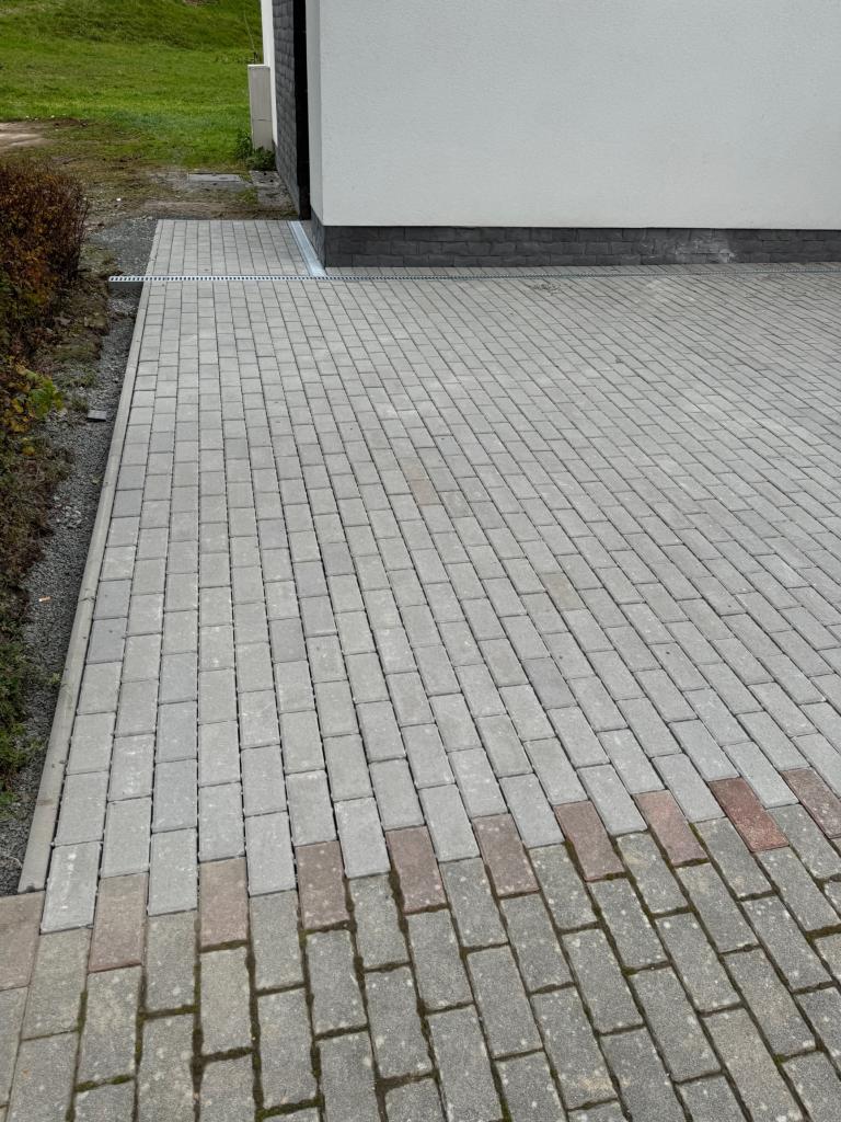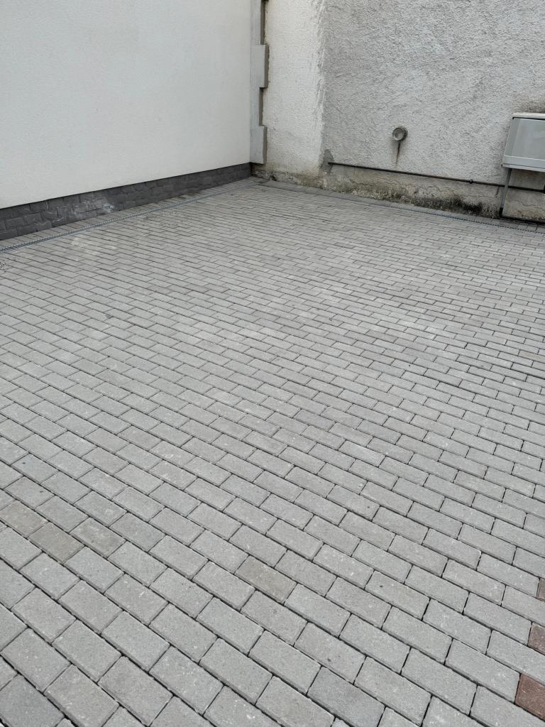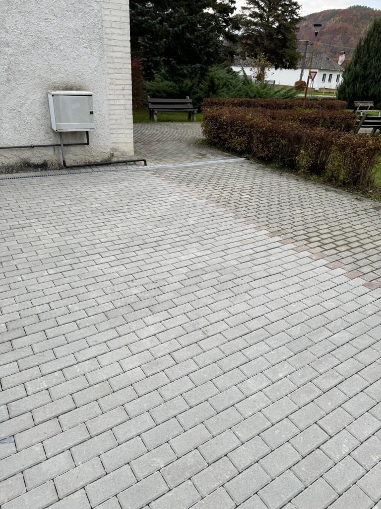 Odstráni sa pôvodna dlažba a podkladná betónová plocha. Jej odstránením znížime množstvo povrchovej vody ktoré podmáčali steny domu smútku a spôsobili poškodenie interiéru domu smútku. K vonkajším stenám sa osadia žľaby , ktoré odviedú prebytočnú vodu z prívalových dažďov do zeleného pásu. Novým kameninovým lôžkom a osadením zámkovej dlažby pod správnym spádom bude zabezpečený priesak povrchovej vody do vegetácie.